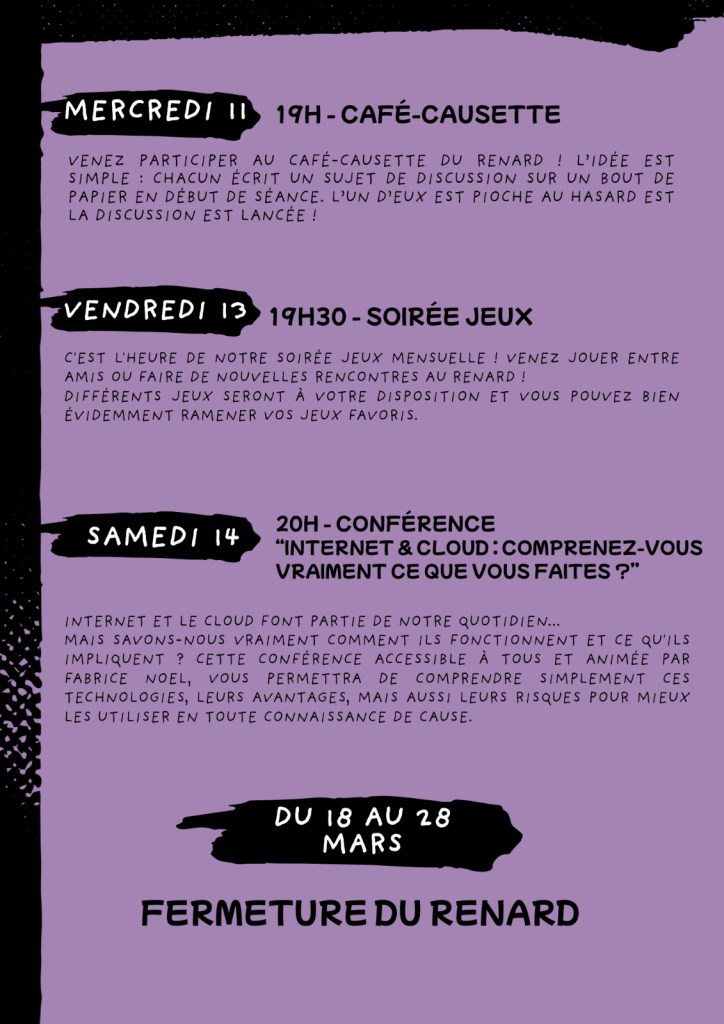 Nous sommes en train de créer l’association, « Les ami.e.s du Renard » pour organiser les animations socio-culturelles du lieu ! L’idée est d’inviter toutes les personnes qui le souhaitent à venir organiser un événement, un atelier ou une animation à travers cette association. Si le projet t’intéresse, envoi nous un petit mail !