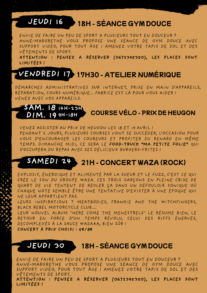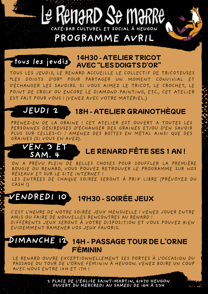Nous sommes en train de créer l’association, « Les ami.e.s du Renard » pour organiser les animations socio-culturelles du lieu ! L’idée est d’inviter toutes les personnes qui le souhaitent à venir organiser un événement, un atelier ou une animation à travers cette association. Si le projet t’intéresse, envoi nous un petit mail !