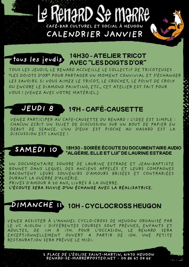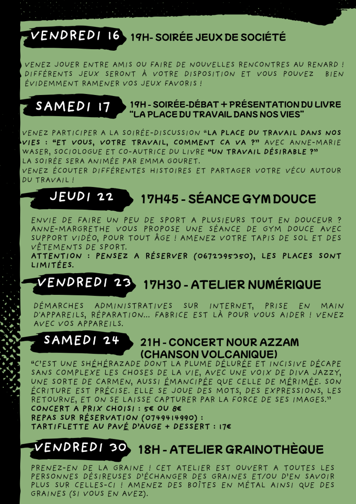 Nous sommes en train de créer l’association, « Les ami.e.s du Renard » pour organiser les animations socio-culturelles du lieu ! L’idée est d’inviter toutes les personnes qui le souhaitent à venir organiser un événement, un atelier ou une animation à travers cette association. Si le projet t’intéresse, envoi nous un petit mail !